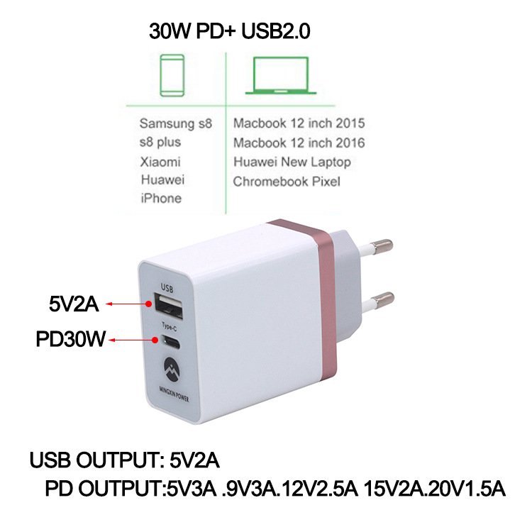 隨著USB-PD標準演變,將掀起新一波USB應用革命。USB在資料傳輸方面早已成為業(yè)界普遍採用的標準協(xié)定,而隨著更高傳輸速率的USB 3.0規(guī)格問世,更進一步增進其音訊/視訊傳輸應用的價值30WPD快充運用而生,它電源主要運用于平板電腦,手機,MACBOOK ,游戲機等,30W PD電源采用TYPE-C接口+USB2.0 雙口的連接方式,給用戶更方便的選擇。 PD30W充電器有5個電壓段:TYPE-C接口輸出:5V3A ,9V3A,12V2.5A,15V2A,20V1.5A
