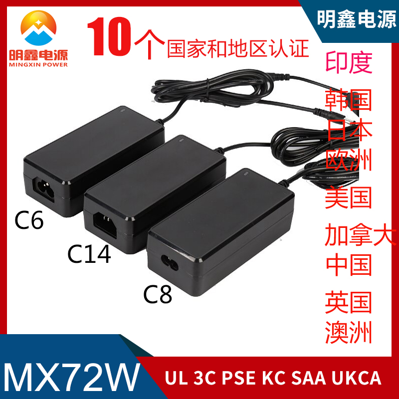 MX72W系列電源適配器,輸出電壓3.6V-48V,輸出電源0.1-8A ,主打型號有5V8A,9V6A.12V4A,12V5A,12V6A,19V3.42A,19V3.78A,24V3A,24V2.5A電源適配器等